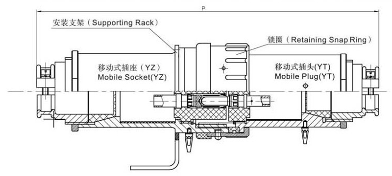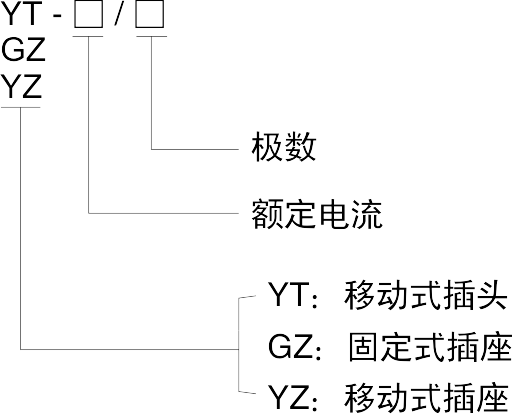> 該電連接器有插頭和插座兩部分組成,其中插頭為移動式(YT),插座有 3 種形式選擇:①面板固定式(GZ)、②移動式(YZ)和③斜式固定插座(XGZ)。